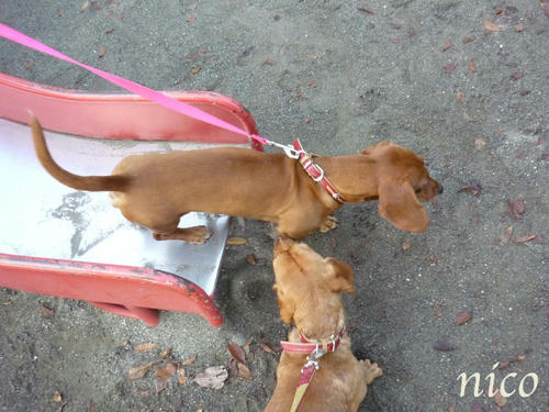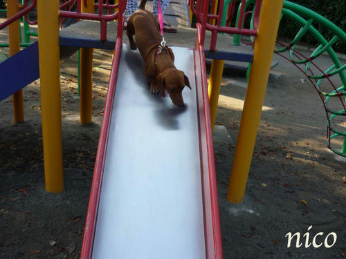 公園で滑り台だよー (小さい子の遊ぶものなので、ちゃんとタオルで拭いてきました。)