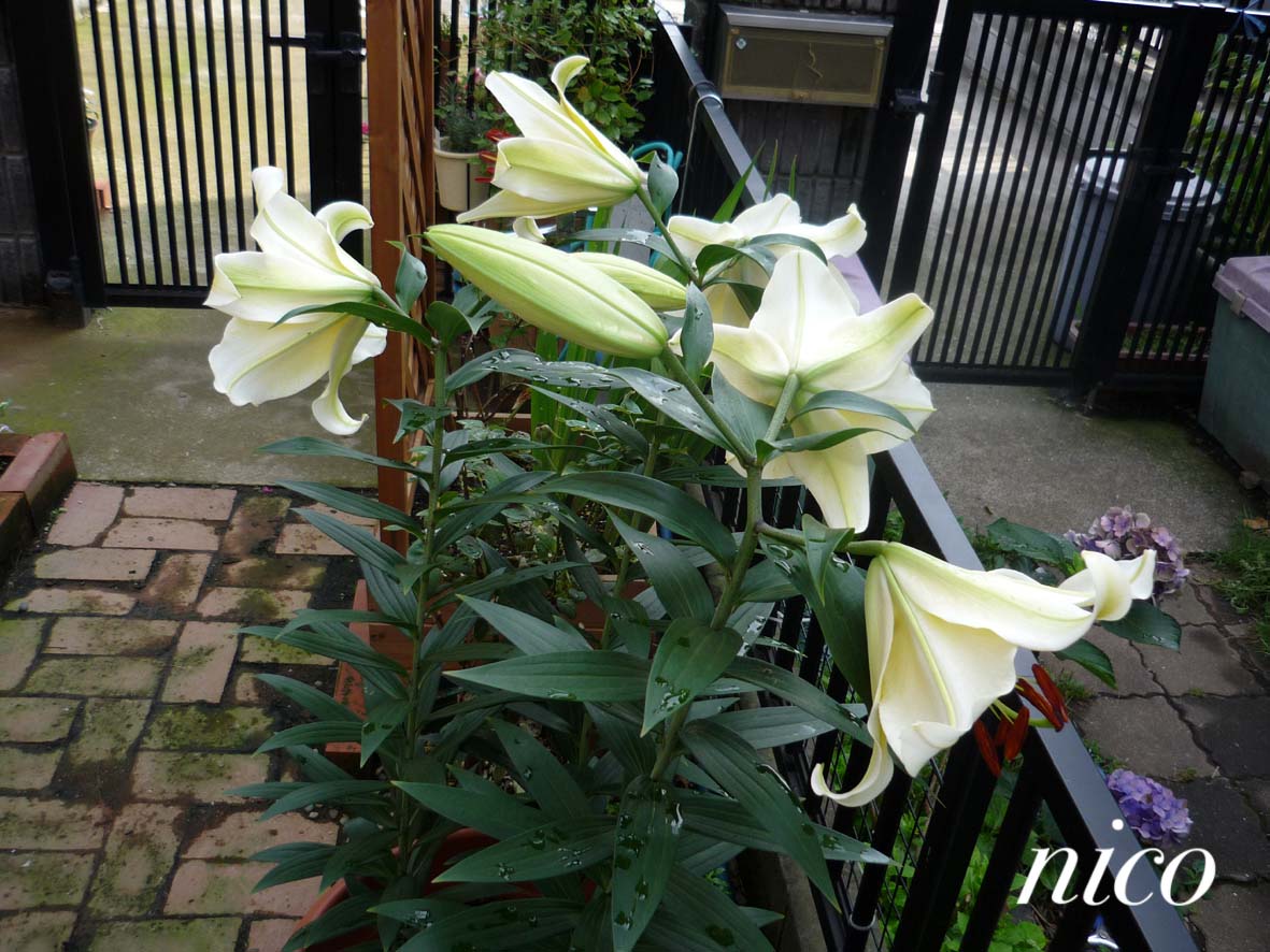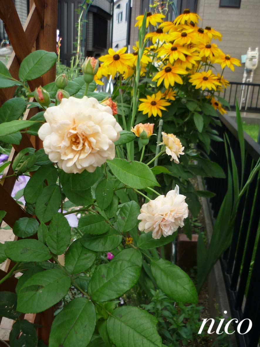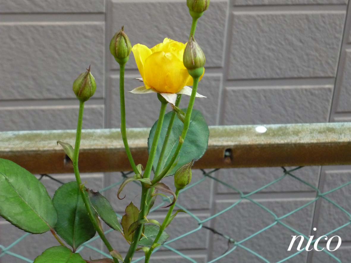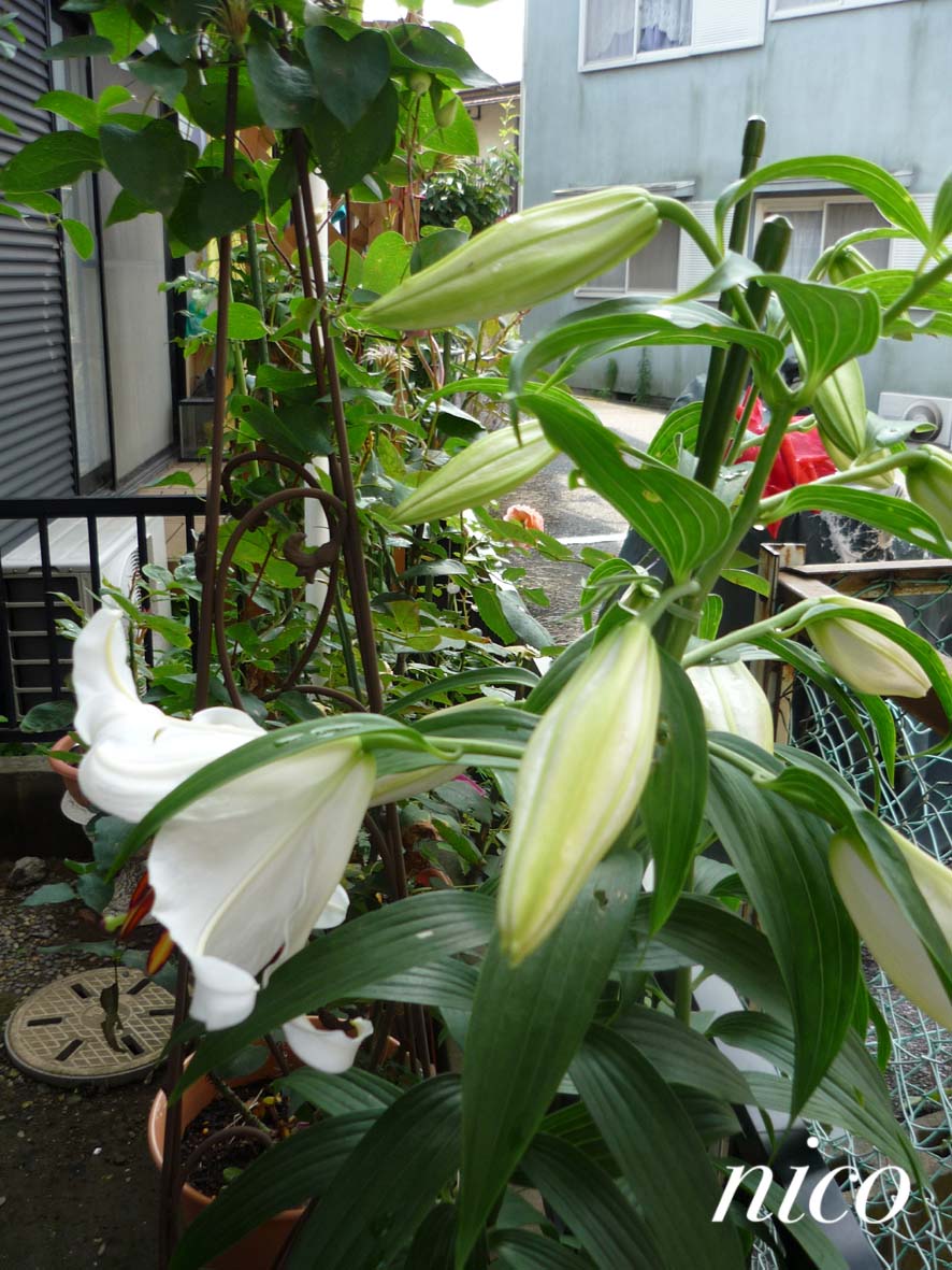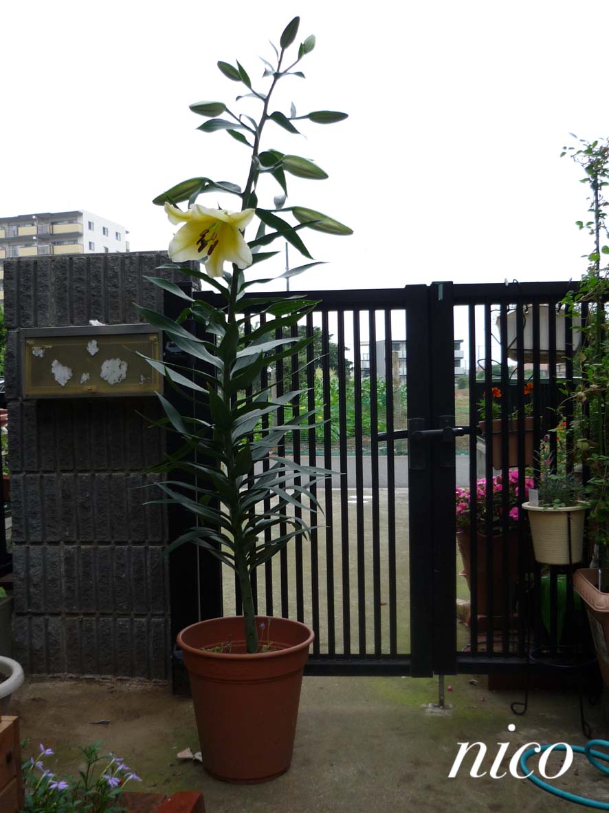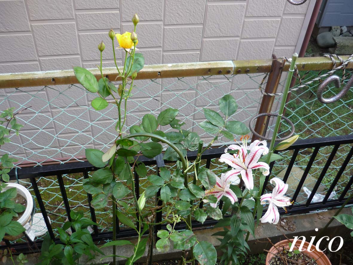 風で何度も倒れたけど無事咲いた、根性コンカドールです。