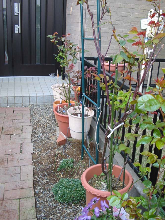 右手前のバラ(チャールストン)とまだ姿の見えないクレマチスが