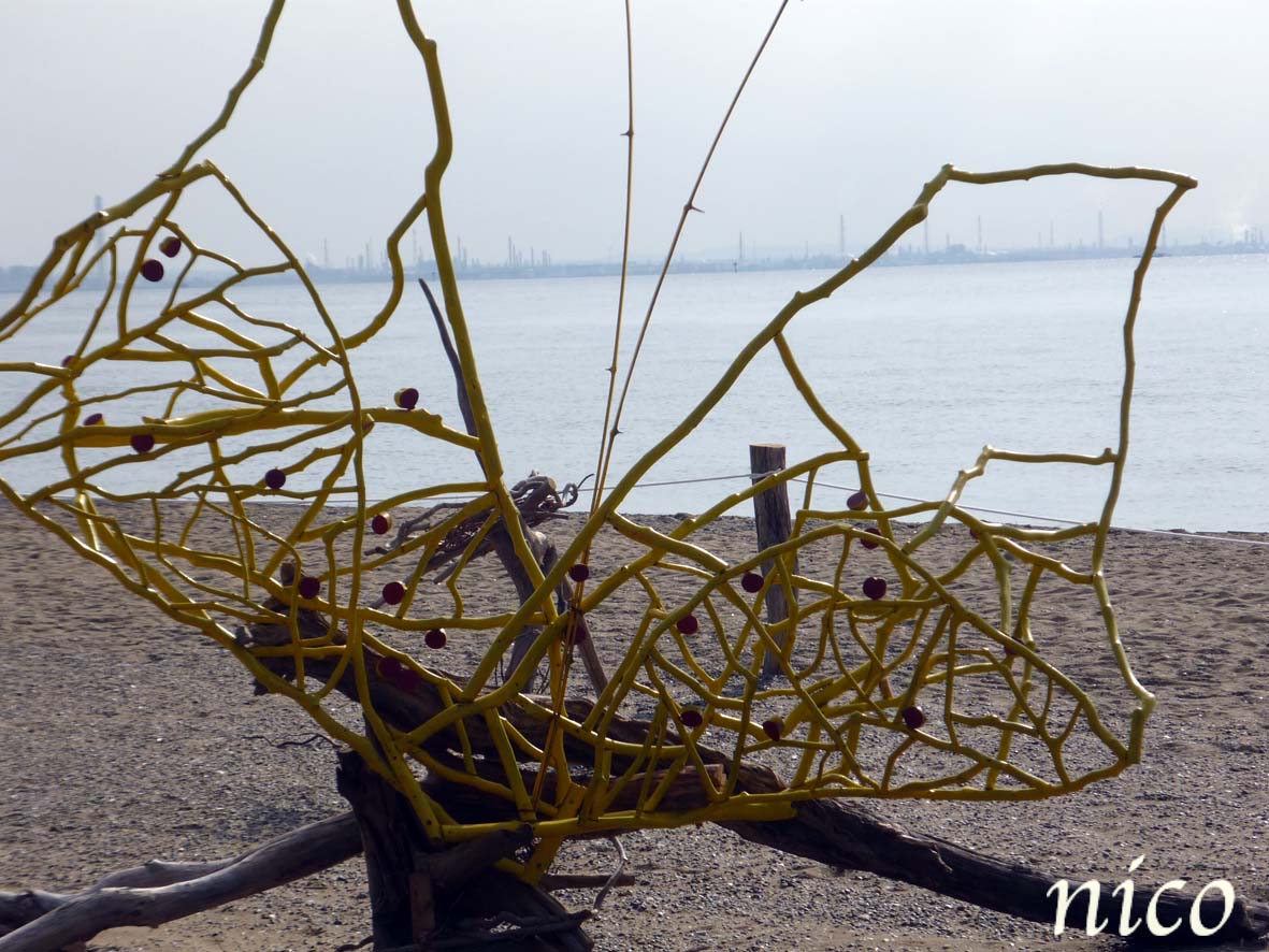 砂浜に流木のオブジェ