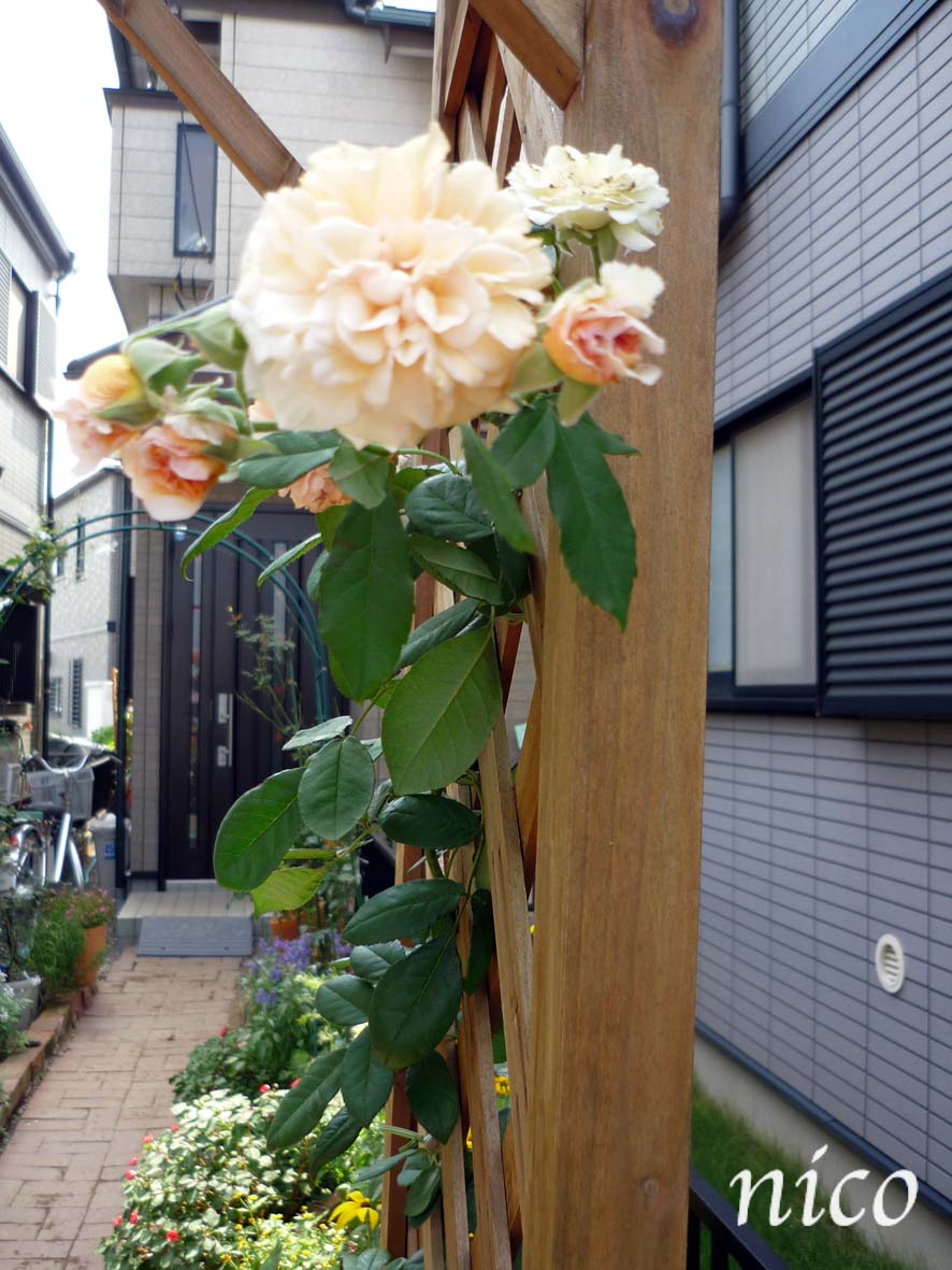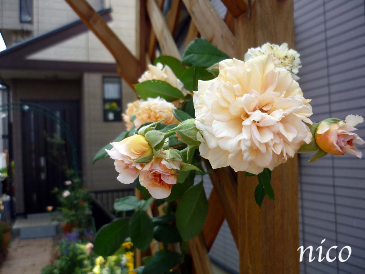 花の枯れた葉っぱを取ったり、バラに支柱を立てたりしたまでは