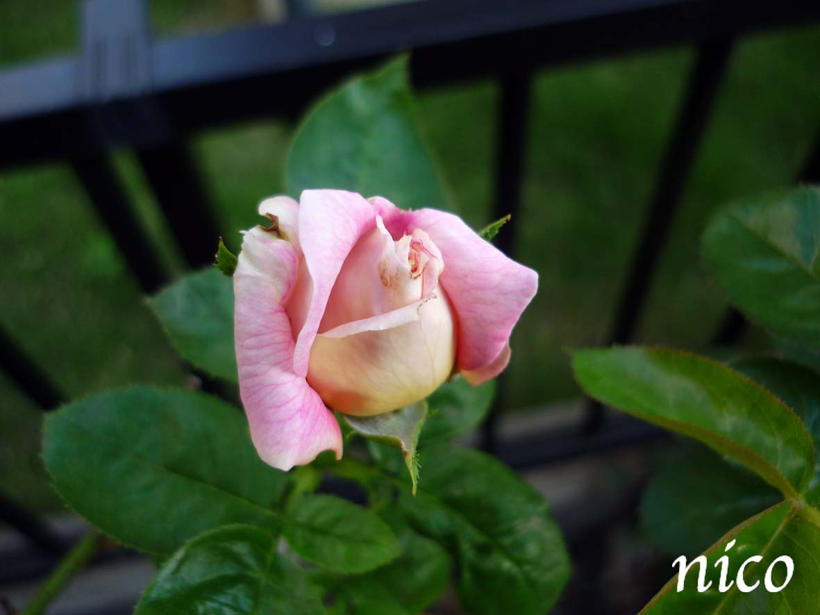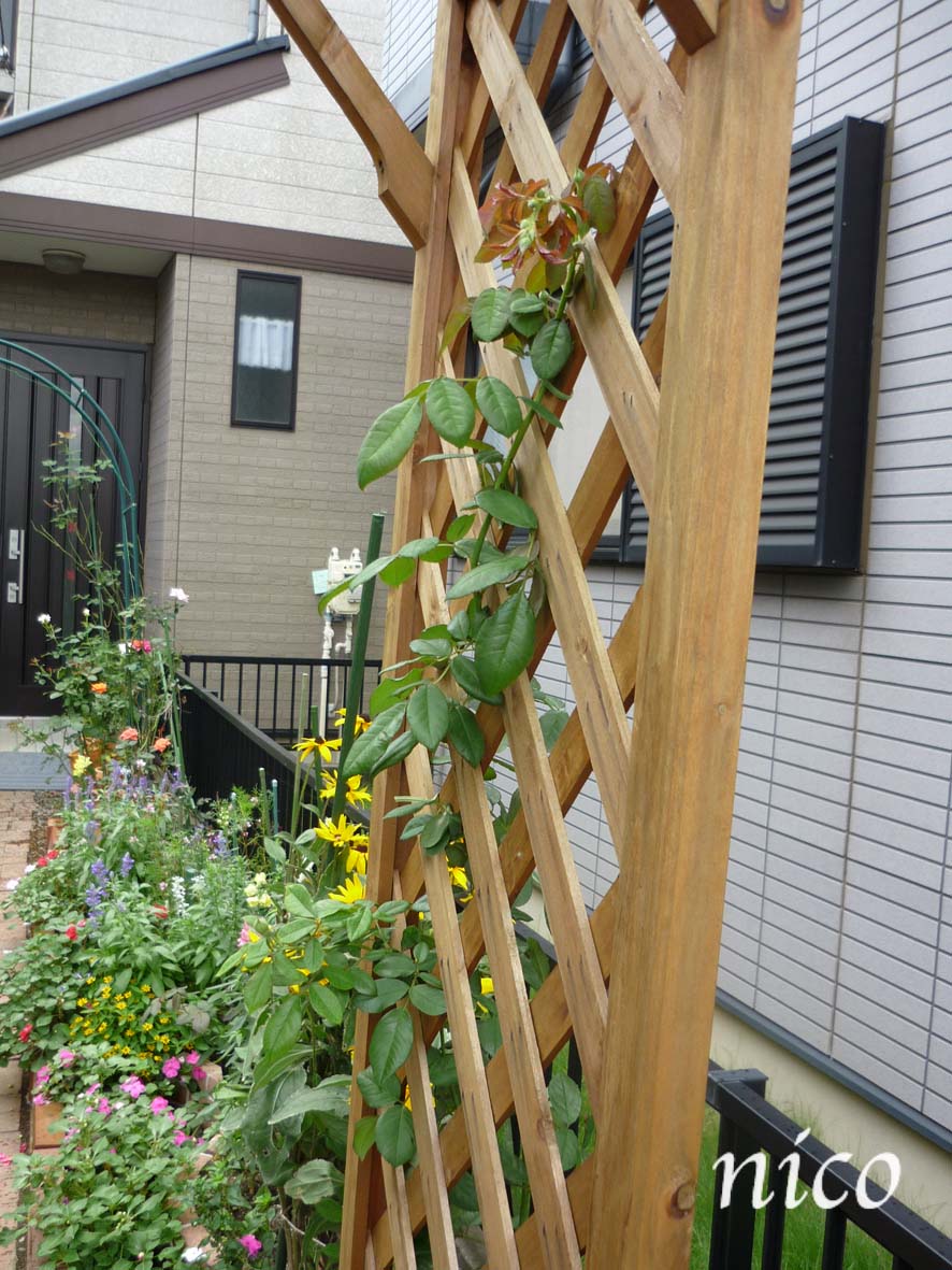 パーゴラにやっとバラが絡んできましたよー